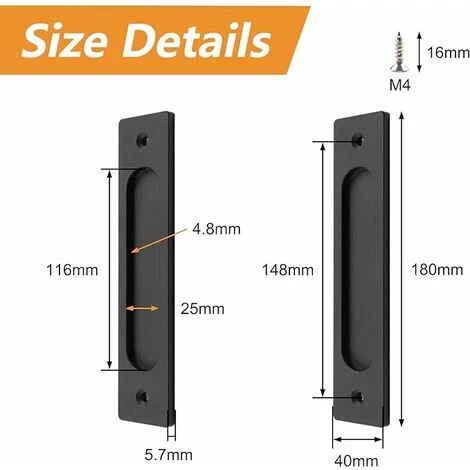 Style moderne : cette poignée de porte coulissante rectangulaire encastrée a un design moderne, noir mat et un design astucieux encastré, ce qui la fait se fondre parfaitement avec d’autres meubles modernes de votre maison, apportant une ambiance urbaine à votre espaceMatériau de qualité supérieure : la poignée est fabriquée en alliage d’aluminium sélectionné, et la surface est galvanisée, ce qui est confortable au toucher et ne rouille pas et ne se corrode pas facilement. La méthode de production monobloc le rend difficile à briser.Large application : la couleur classique assortie est adaptée à la plupart des portes intérieures et extérieures, telles que les portes coulissantes, les portes de poche et les portes pliantes. Convient également pour les armoires, armoires, armoires de salle de bain et autres meublesFacile à installer : contrairement à la poignée intégrée générale, nous n’avons pas besoin de creuser des rainures pour l’installation, en utilisant pleinement l’épaisseur de la poignée elle-même, vous avez seulement besoin de fixer la poignée avec les vis fournies pour terminer l’installationContenu de l’emballage : la taille de chaque poignée est de 180 x 40 mm (L x l). La profondeur de rainure est de 4,8 mm. Veuillez vérifier la taille avant d’acheter