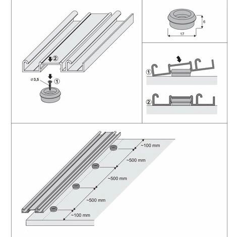 4x Support de guide inférieur pour porte coulissante ; Matière = Plastique ; Couleur = Gris ; Dimensions = 17 x 6mm ; A visser (vis non incluses)