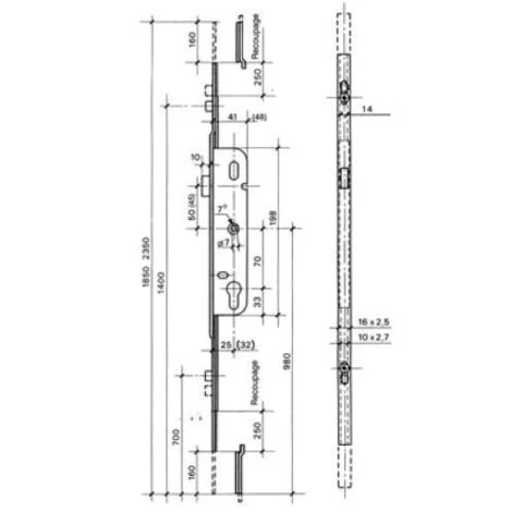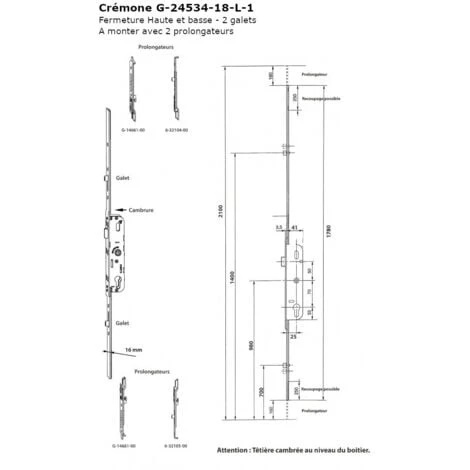 PrĂ©vue pour des portes avec cote D 980mm, la crĂ©mone en elle mĂȘme a une cote D infĂ©rieure et ne se pose pas au niveau bas de la feuillure. PosĂ©e de cette facon, les galets intermĂ©diaires sont Ă 700mm et 1400mm du bas de feuillure.