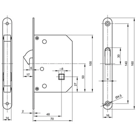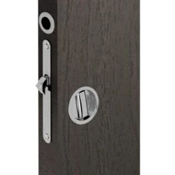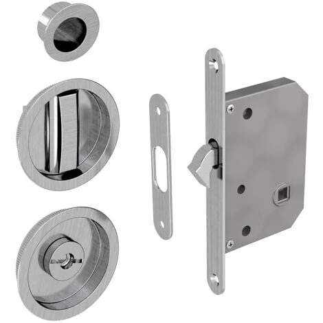 Serrure à crochet à encastrer avec poignées rondes et tire-doigt pour porte coulissante.