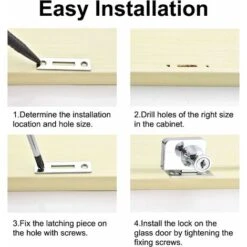 Installation facile : après avoir déterminé la position, percez des trous appropriés sur l’armoire, puis fixez la partie serrure sur le trou avec des vis, et enfin installez la serrure sur la porte vitrée.
