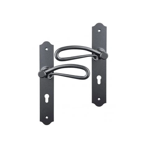Garniture complète sur plaque – ensemble de 2 poignées de porte extérieure – en style fer forgé finition patiné, fonction Clé I pour cylindre de serrure de porte d’entrée ou de bureau.