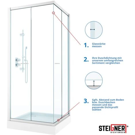 - STEIGNER fabrique plus de 60 modèles différents. Notre gamme comprend également des joints de douche pour le verre de 3,5 mm, 4 mm, 5 mm, 6 mm, 7 mm et 8 mm